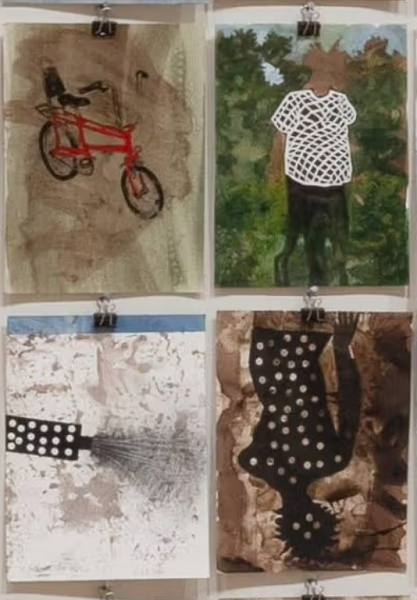 [Shown above: 1) Gallery view of Tropical Night. 2) Detail from Christopher Cozier’s March 2024 installation of Tropical Night. 2006–14. 268 sheets with acrylic, ink, colored ink, pencil, and colored pencil on paper, some with stamped ink, stencil, solvent transfer, and cut-and-pasted colored and painted paper, each 9 × 7″ (22.9 × 17.8 cm). The Museum of Modern Art, New York. Latin American and Caribbean Fund and Fund for the Twenty-First Century. © Christopher Cozier.]