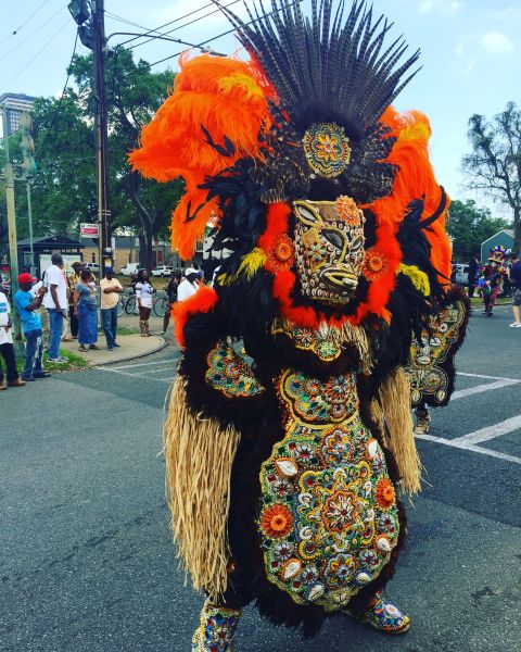 [Photo courtesy Nikki Fernandes: A performer dressed in cultural costume dances through the streets of New Orleans during a festival.]
